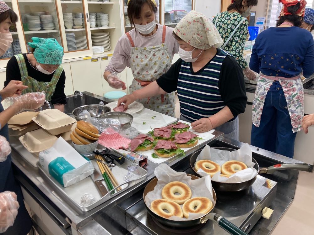 ベーグルサンド・キャロットラペの作り方、美味しいコーヒーの淹れ方の説明がToshiko先生からあり、参加者から定期的な開催を熱望されるほど、とても楽しく、美味しい料理の完成に全員大満足となった生涯学習でした。