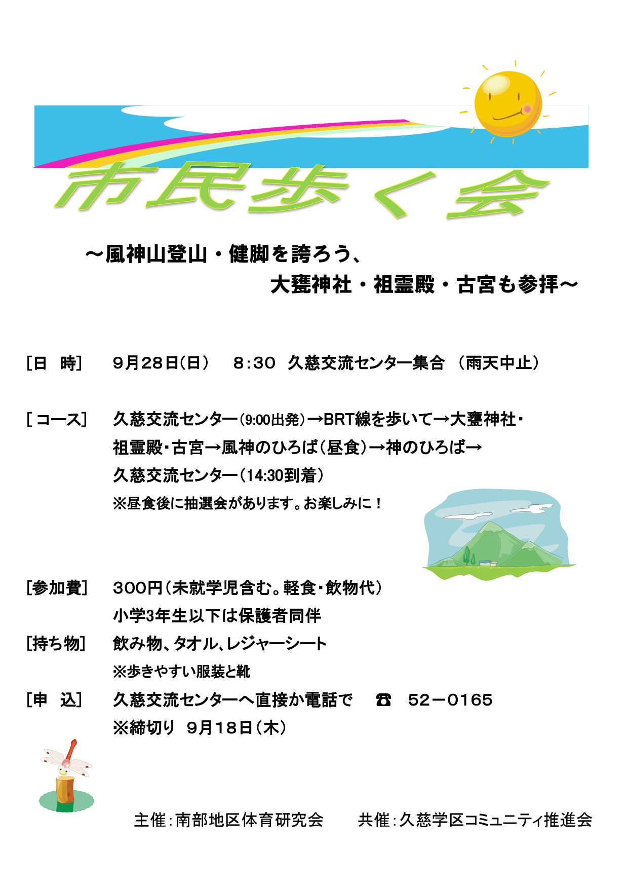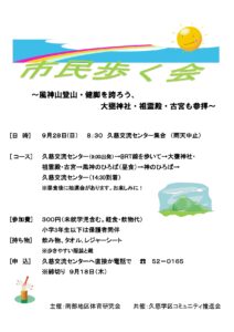 お知らせ ホーム > お知らせ一覧 > 活動 > 【9月28日】南部地区体育研究会主催「市民歩く会」 活動 202509.30 【9月28日】南部地区体育研究会主催「市民歩く会」 風神山登山~健脚を誇ろう~ 大甕神社・祖霊殿・古宮も参拝 令和7年9月28日(日)南部地区体育研究会主催の「久慈地区市民歩く会」が開催されました。 16名の参加者が集まる中、総勢27名にて約10㎞のコースを歩き、風神山山頂での昼食時には抽選会を行って楽しみました。 ご参加いただいた皆様、ありがとうございました。 前の記事へ 活動一覧にもどる 次の記事へ
